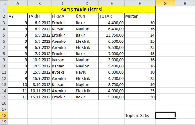 şeklinde kullanmanız gerekir. Bu formül bize Erbakır firmasının yapmış olduğu satışların toplamını verir.