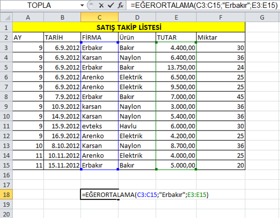Örneğin aşağıdaki tablomuzda Erbakır firmasının Tutar ortalamasını bulmak için Eğerortalama işlevini aşağıdakine benzer şekilde kullanmamız gerekir.