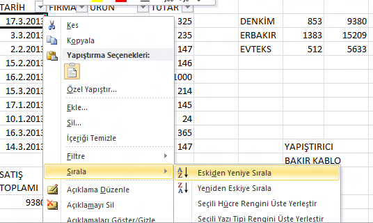 Özel Sıralamadan yararlanarak birden fazla alana göre sıralama yapabilirsiniz. Örneğin yukarıdaki resimde tablonuz öncelikle Firma sütununa göre sıralanır, Firması aynı olanların Ürünleri Artan şekilde sıralanır.