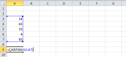 =ÇARPIM(A3:A7) Yazarak Enter tuşuna bastığınızda, A3 ile A7 aralığındaki değerlerin çarpıldığını görürsünüz.