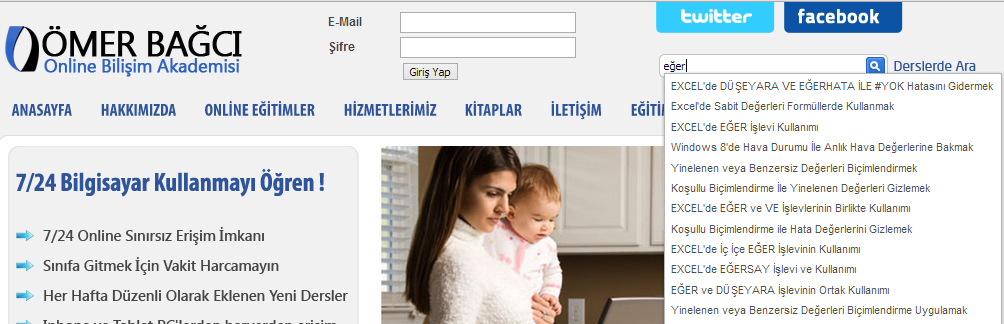 Online Excel eğitimlerinizi tamamlayabileceğiniz, 7/24 Online olarak çalışan Ömer BAĞCI Bilişim Akademisindeki ana giriş sayfasında arama modülü eklendi. İstediğiniz konunun adını yazdığınızda o konu ile ilgili olan konu başlıkları aşağıya doğru açılarak, sizin istediğiniz konu videosuna hızlı bir şekilde erişebilirsiniz.
