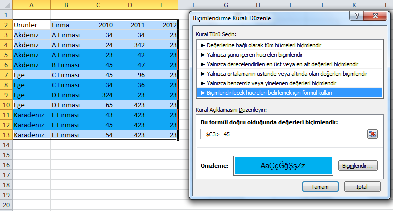 Örneğin aşağıdaki satış tablosunda eğer, C3>=45 olduğu değerleri biçimlendirmek isterseniz, tablonun tamamını seçtikten sonra Yeni Kural’da Biçimlendirilecek hücreleri belirlemek için formül kullan seçeneğinde formülü =$C3>=45 olarak belirlemeniz gerekir.