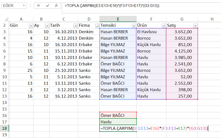 Topla.Çarpım İşlevi sadece iki, üç sütunun birbiriyle çarpımı ile kullanabileceği gibi, şarta bağlı olarak ‘da kullanılabilir.