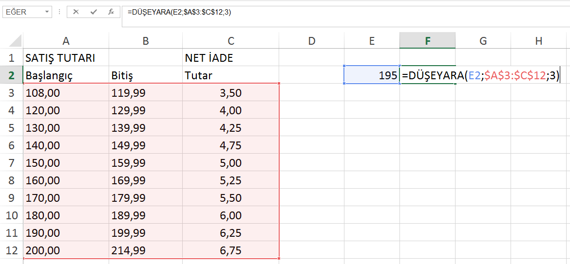 Excel Düşeyara işlevi, Excel de hemen hemen herkesin ihtiyaç duyduğu ve kullandığı bir işlevdir. Genelde 1-1 eşleme yapmak için kullanılan Düşeyara işlevi ile iki sayı aralığının, arasında kalan değerleri de buldurmak mümkündür.