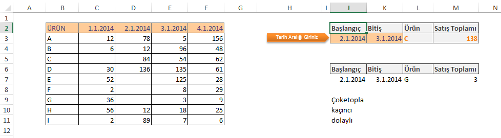 Bu örnek’te sadece çoketopla işlevini tek başına kullanmak yetmez. çünkü Başlangıç ve bitiş tarihlerini seçmekle birlikte bir Ürün seçmemiz gerekiyor. Burada ürün bizim toplam alınacak olan satırı belirliyor.