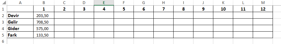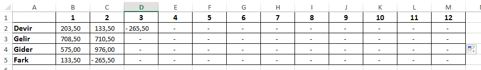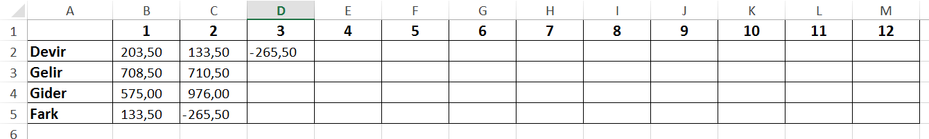 Burada B2 hücresindeki ilk değeri kendimizin yazması gerekir.  Bir önceki yıldan devrolan KDV tutarını B2 hücresine yazabilirsiniz.