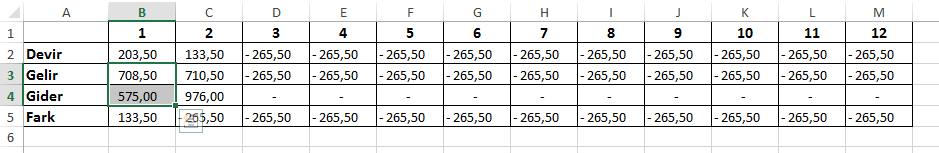 B5 hücresine tıklayıp, Gelir – Gider şeklinde formül uygulayarak KDV devir mi var, ödeme mi çıkıyor sorusuna cevap bulabiliriz.