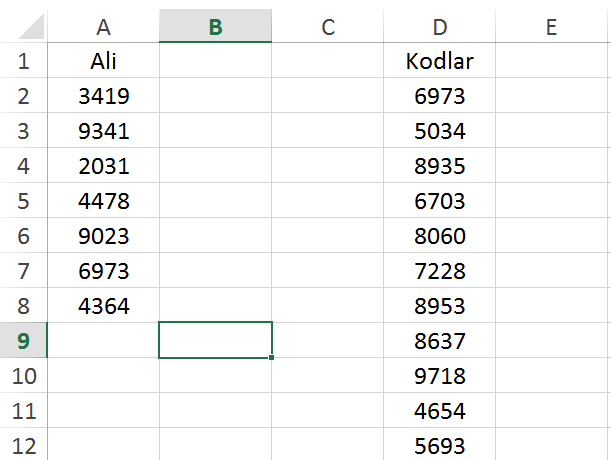 Aşağıdakine benzer bir tablonun olduğunu düşünelim. Bu durumda A2:A8 aralığındaki değerlerin D sütununda yer alan kod listesinde olup olmadığını Koşullu Biçimlendirme ile bulabilirsiniz.