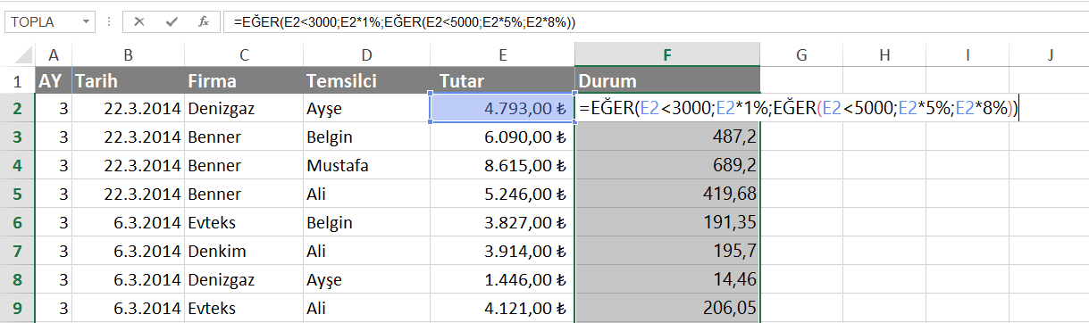 =EĞER(E2<3000;E2*1%;EĞER(E2<5000;E2*5%;E2*8%))