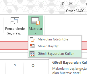 Makroların Göreli Başvuru özelliği’ni kullandığınızda, tıkladığınız hücreler önem kazanır. Çünkü göreli başvuruları seçtiğinizde, Excel; aktif hücrenin konumunu ve makro içinde aktifleşen hücrelerin adreslerine dikkat eder.