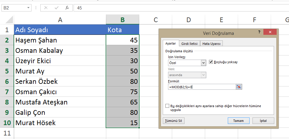 Tamam düğmesine bastıktan sonra, seçmiş olduğunuz aralığa 5 ve 5’in katlarından başka sayılar giremezsiniz.