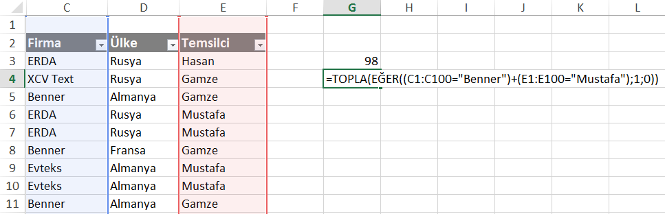 =TOPLA(EĞER((C1:C100=”Benner”)+(E1:E100=”Mustafa”);1;0)) formülünü yazdıktan sonra Ctrl + Shift + Enter tuşlarına basmanız gerekir. Bu işlev ÇOKEĞERSAY işlevinin yapmış olduğu işlemi yapar.