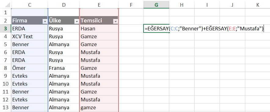 =EĞERSAY(C:C;”Benner”)+EĞERSAY(E:E;”Mustafa”)
