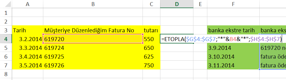 Burada Etopla işlevini kullanırken, ölçüt kısmında kullandığımız “*”&B4&”*” ölçütünün anlamı: