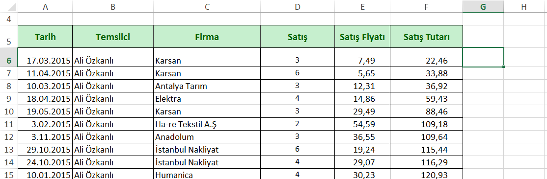 - Satış tablosunda G6 hücresine tıklayın.