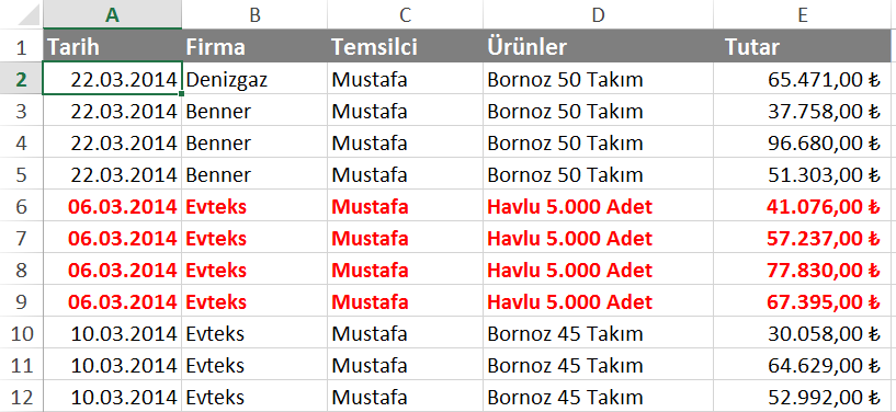 Koşullu biçimlendirme ve Haftanıngünü işlevlerini birlikte kullanarak, satış listelerinizde haftanın belirli gününe gelen tarihleri işaretleyebilirsiniz. Aşağıdakine benzer bir tablonuzun olduğunu ve bu tablo’da Excel’deki koşullu biçimlendirmeleri kullanarak, haftanın belirli bir günü yapılan satışları işaretlemek istediğinizi düşünelim.