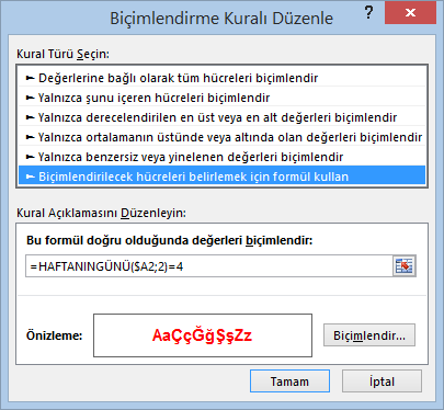 =HAFTANINGÜNÜ($A2;2)=4 formülünü kullanırken $A2 yazmanız önemlidir.