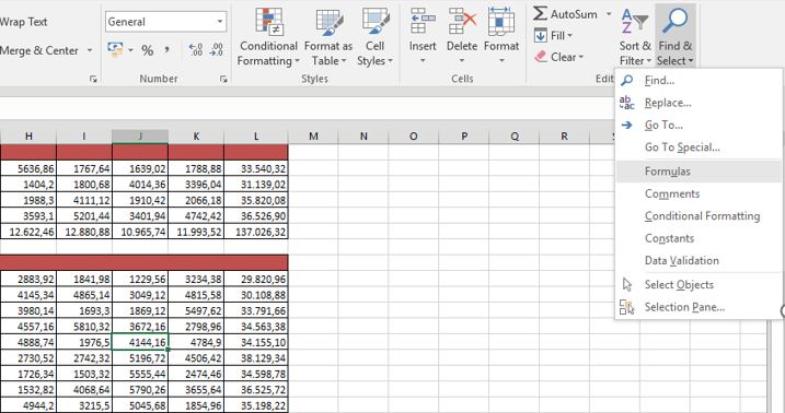 Bul & Değiştir kısmında bulunan Formüller seçeneğini seçerek, tablonuzdaki tüm formüllerin seçilmesini sağlayabilirsiniz. Bu sayede formül içeren hücreleri renklendirme ve zemin rengi verme gibi işlemleri rahatlıkla yapabilirsiniz.