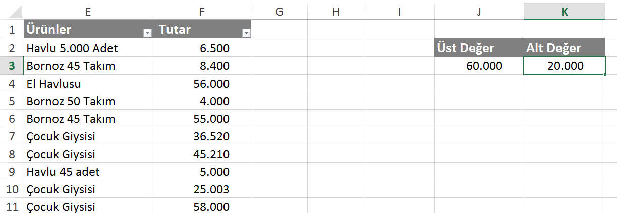 Koşullu biçimlendirme’de üst rakam olarak olarak kullanacağınız J3 hücresine tıklayın. Alt değer olarak kullanacağınız kısma ise K3’e tıklayın. Bu sayede üst değer ve alt değerleri şarta bağlı olarak kullanabilirsiniz.