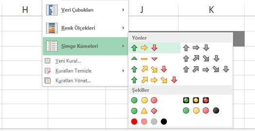 Koşullu Biçimlendirme uygulayacağınzı Aralığı seçtikten sonra, Giriş sekmesinde yer alan Simge Kümleri’nin üzerine geldiğiniz de Yönler, Şekiller gibi farklı seçeneklerden yararlanarak istediğiniz simgeyi seçebilirsiniz.
